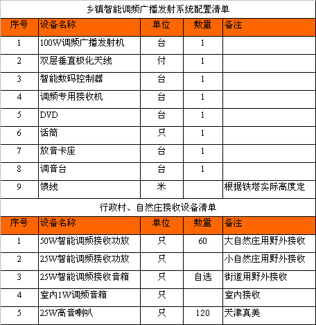 主要设备有智能编码器、调频发射机、各种音频播出系统、调音台、调频收扩音机;室内调频音箱、室外调频音柱等设备组成。
